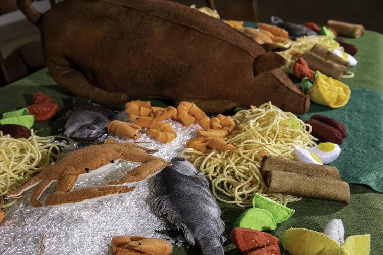Balikbayan also includes Kain Tayo!, a felt soft sculpture table installation of a Filipino kamayan. A kamayan is a Filipino communal feast where food is served directly on banana leaves and also refers to a Filipino method of eating with your bare hands. Growing up, I collected many stuffed animals and the soft sculptures in Kain Tayo are a tribute to childhood comforts that entertain both comfort foods and the comfort of a plush toy.