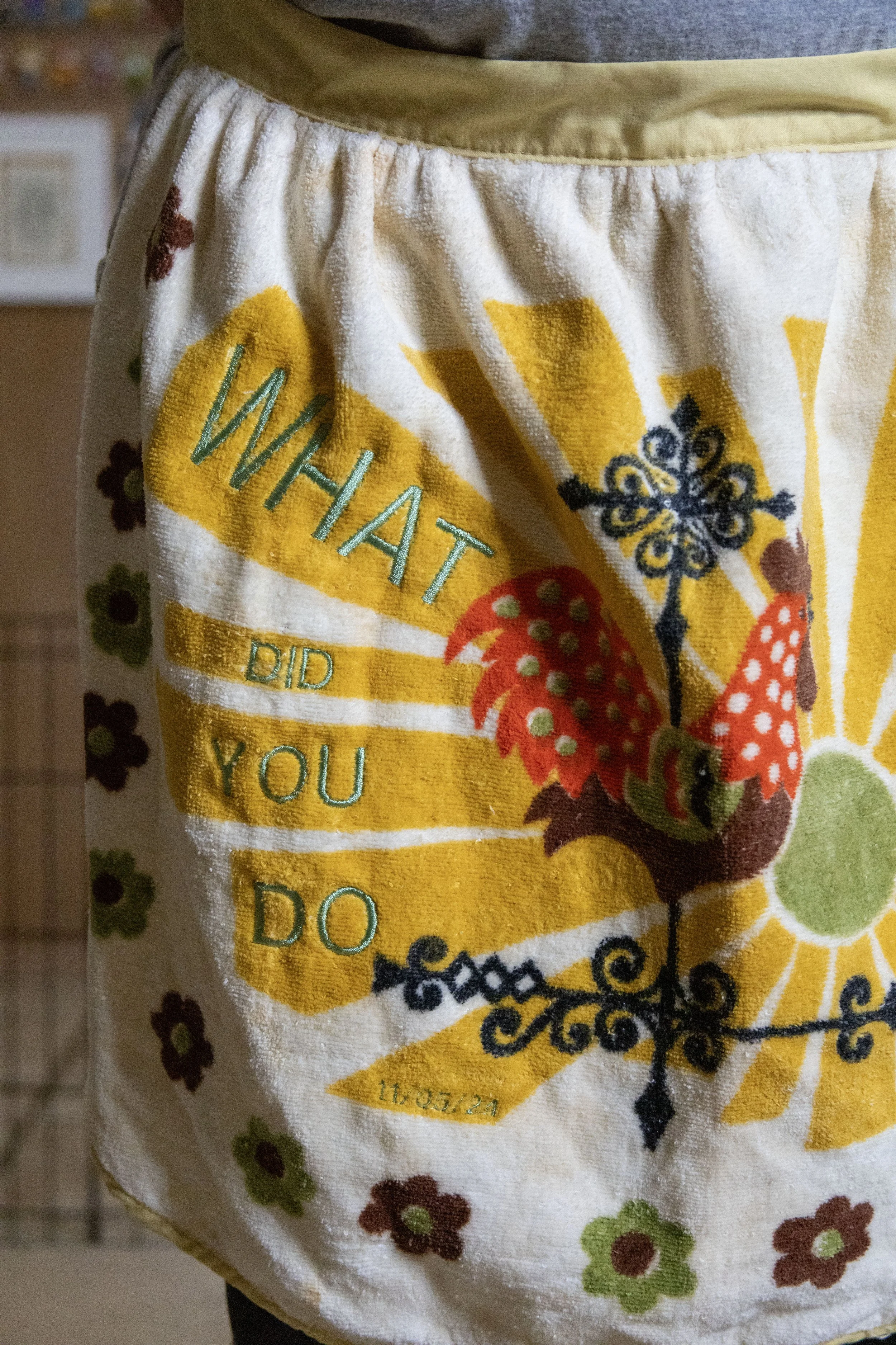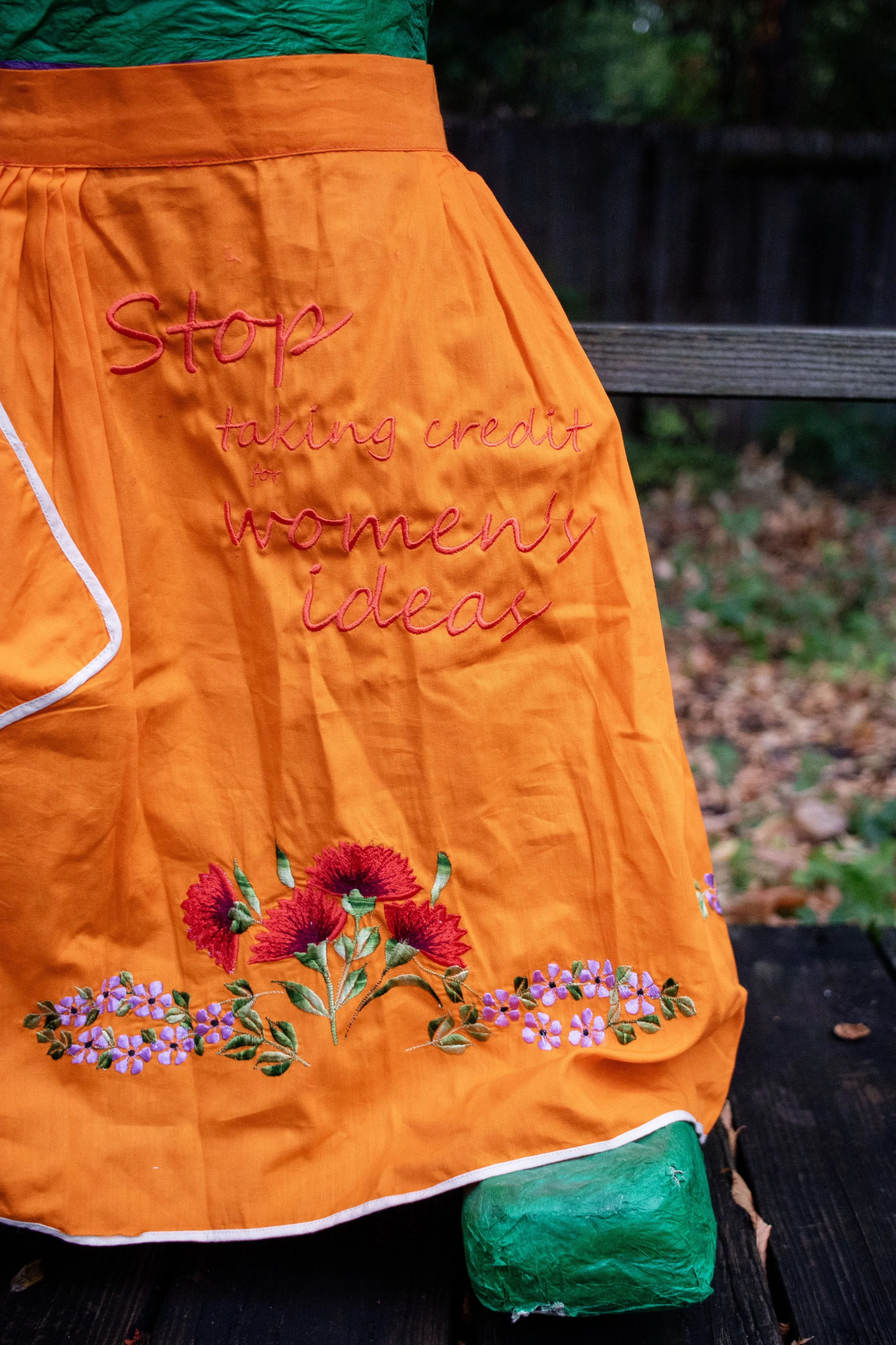 “Kitchen Talk” highlights specific issues such as wage inequality or trans rights, thru text embroidered or appliquéd on vintage aprons. In part, I like to think the aprons connect to the expectations and the cult of domesticity shoved upon women.